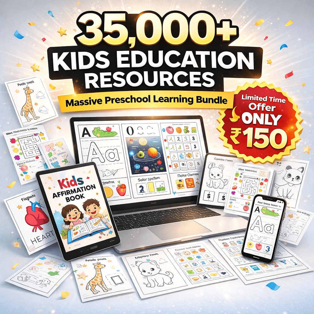 The bundle includes 35,000+ printable worksheets and learning activities covering alphabets, phonics, numbers, math, tracing, puzzles, coloring, handwriting practice, and many more educational resources designed for kids’ overall development.